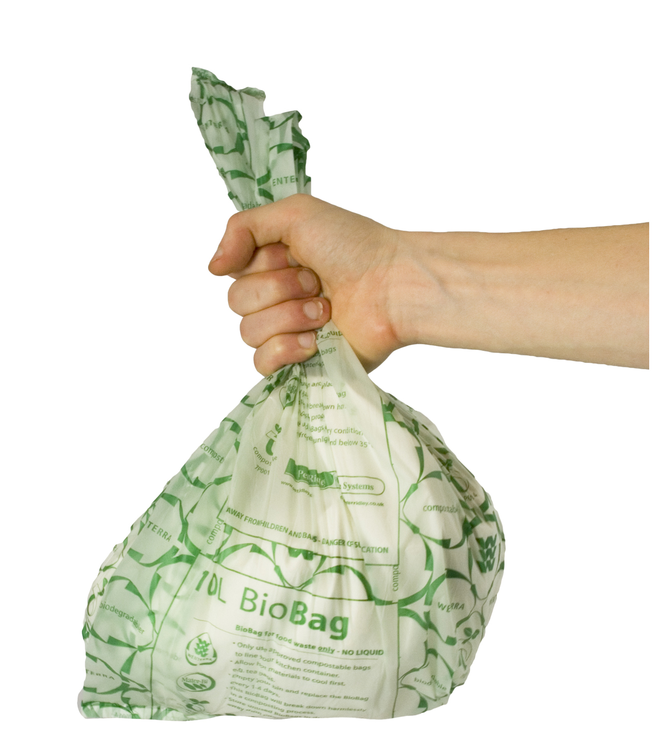 You can use compostable/biodegradable 'plastic' bags to line your kitchen caddy if you wish, and these can be accepted in your outdoor caddy. The liners will not be composted, they are removed at an early stage of processing and used to generate energy. Other types of bio-plastic packaging e.g. cutlery will not be accepted in the caddy.